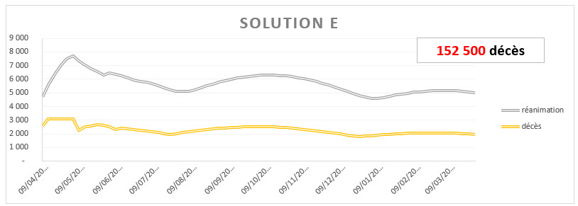 Solution E : Un cas réaliste et pessimiste sur les résultats de la recherche; soit pas de traitement efficace et pas de vaccin. La seule réponse est l'adaptation du confinement (au détriment de l'économie). Les cas de réanimation sont limités à 7 700 (max déja atteint début avril) et le nombre de décès est de 152 000. Mais la pandémie dure jusque juillet à novembre 2023.